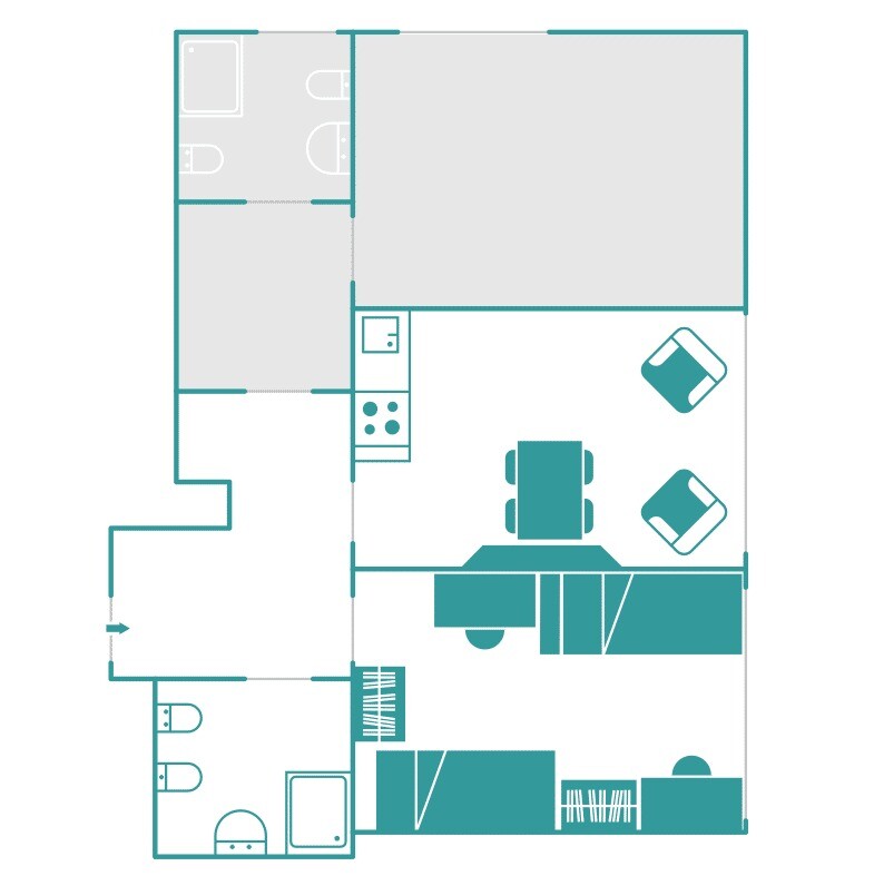 Bed in a twin en-suite room in an apartment shared with another twin en-suite room, featuring a private kitchen and living area.