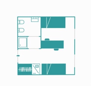 Bed in a twin en-suite room with exclusive access to a reserved shared kitchen with dining area, dedicated to selected accommodation types. Floors 10-12.